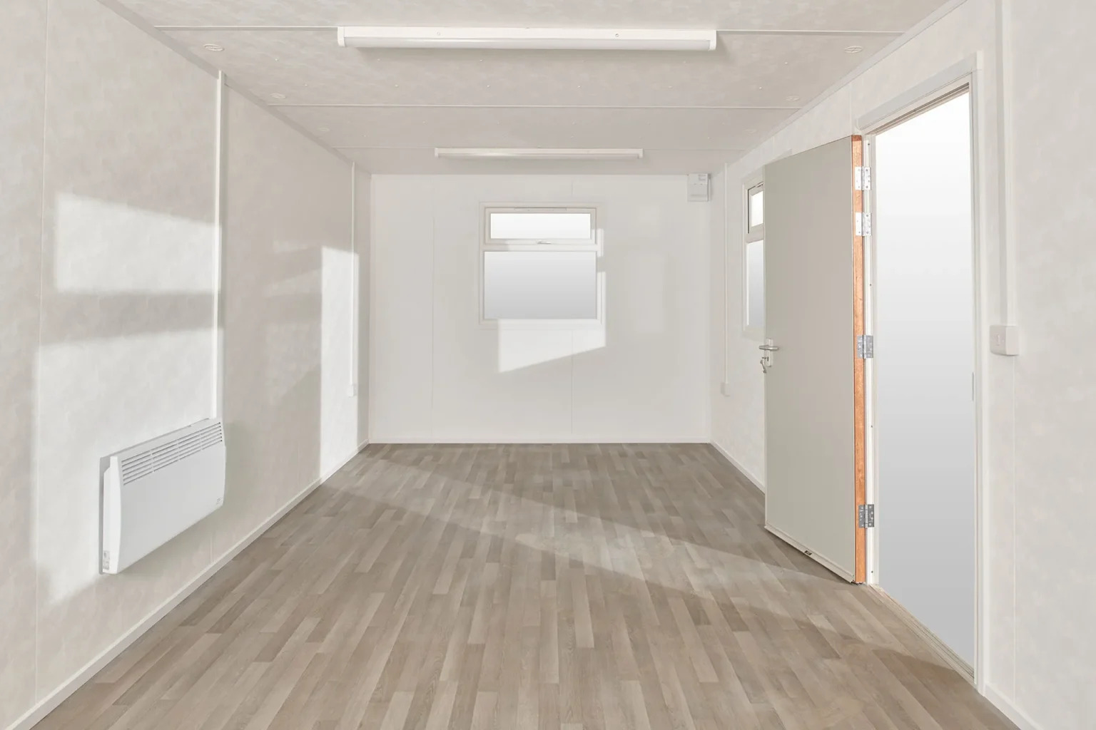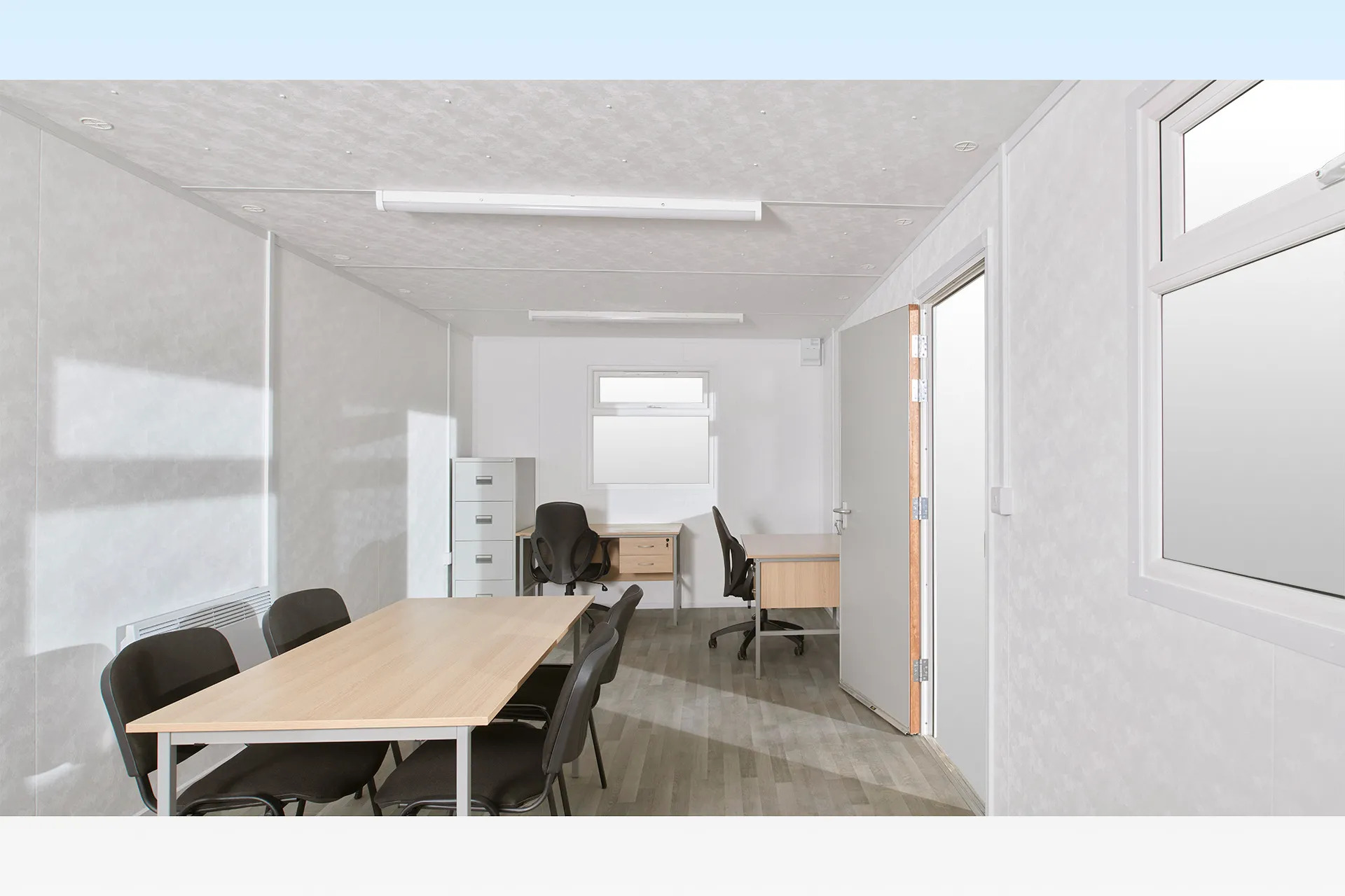 La cabina Jackleg de 24 pies x 10 pies de nuestra gama estándar ofrece un espacio diáfano y versátil, con posibilidad de incluir cantina. Está equipada con: