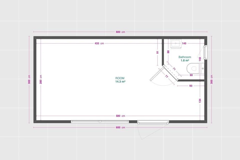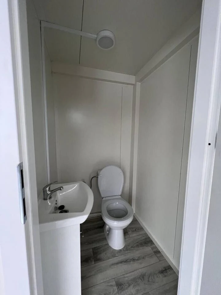 – Paredes, suelo y cubierta: Paneles sándwich PIR (100 mm) con relleno de poliuretano para un excelente aislamiento y eficiencia energética (WDK: 0,24 W/m²). Suelo de PVC con aspecto de madera y un panel de suelo OSB adicional (15 mm). Cubierta con una pendiente del 5 % para un drenaje eficaz del agua.