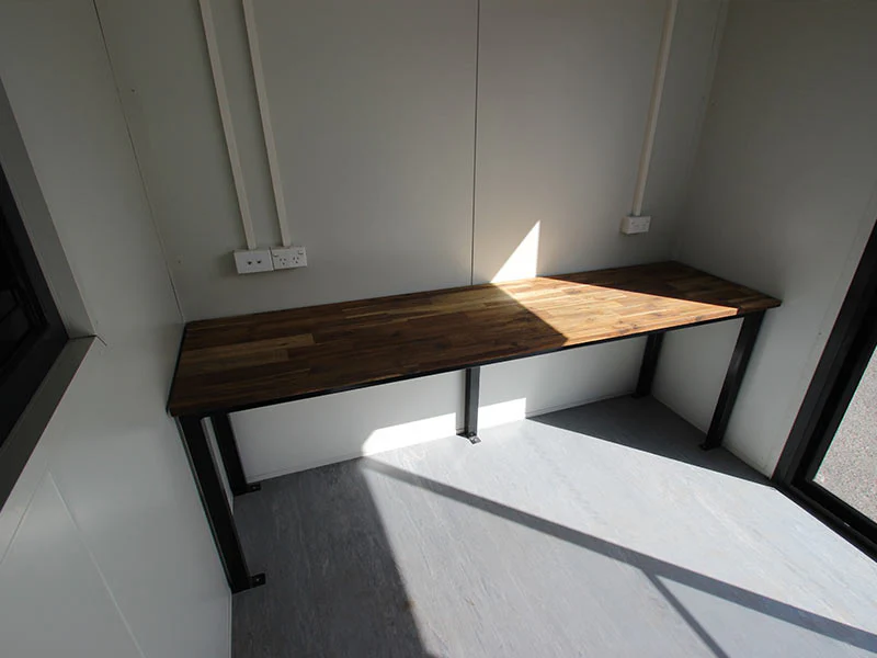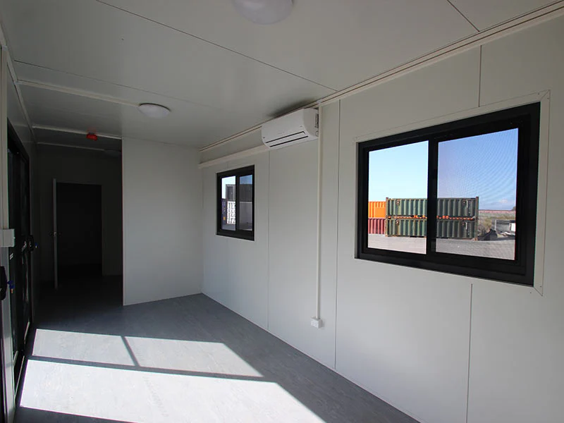 Oficina completa construida a partir de un contenedor marítimo 40’ High Cube nuevo (1er uso), acondicionada y equipada para uso inmediato en obra o instalaciones temporales/permanentes.