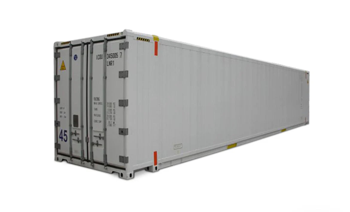 El contenedor refrigerado de 45 pies, tipo Pallet Wide, combina acero Corten con aislamiento de espuma de poliuretano. Su suelo, también de acero, asegura resistencia y durabilidad. La unidad posee una tara de 6.000 kg y puede transportar hasta 28.000 kg, alcanzando un peso bruto de 34.000 kg.