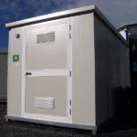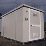 Nuestro bungalow para el almacenamiento de productos fitosanitarios cuenta con un suelo de acero galvanizado con una bandeja de recogida revestida con una rejilla de acero galvanizado. La base está reforzada e incluye un paso para horquillas que permite manipular el módulo con una máquina elevadora equipada con horquillas de 250 cm. El módulo está equipado con una puerta, dos rejillas de ventilación, neón LED, calefacción y una toma de corriente.