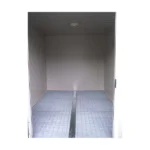 El perfil del techo es de acero galvanizado lacado en gris claro RAL 9002, de 1,5 mm de espesor y 150 mm de altura, con 4 puntos de anclaje para la manipulación con grúa. Los perfiles de la base son de acero galvanizado lacado en gris claro RAL 9002, de 2 mm de espesor y 160 mm de altura, con paso de horquillas (distancia entre ejes de 90 cm) para el desplazamiento con una carretilla elevadora equipada con horquillas de 250 cm.